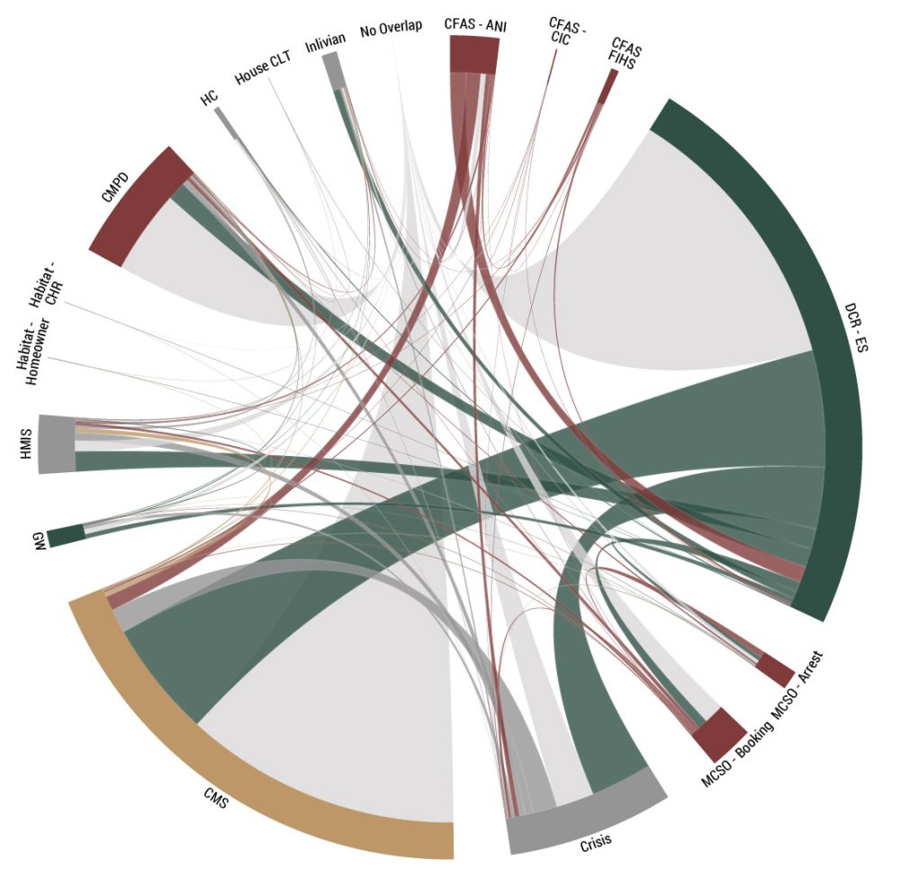 Organizations and programs in our community are connected by the people they serve. The ability to see connections across programs and partners allows researchers, leaders, and advocates to ask questions about them to better coordinate services, observe gaps, and better serve those in our community that are engaged in multiple organizations and systems. And importantly, since most of our data are collected on difficult days in people’s lives it shows us that some people and neighborhoods are more likely or less likely to to experience the quality of life we seek for everyone in the region.